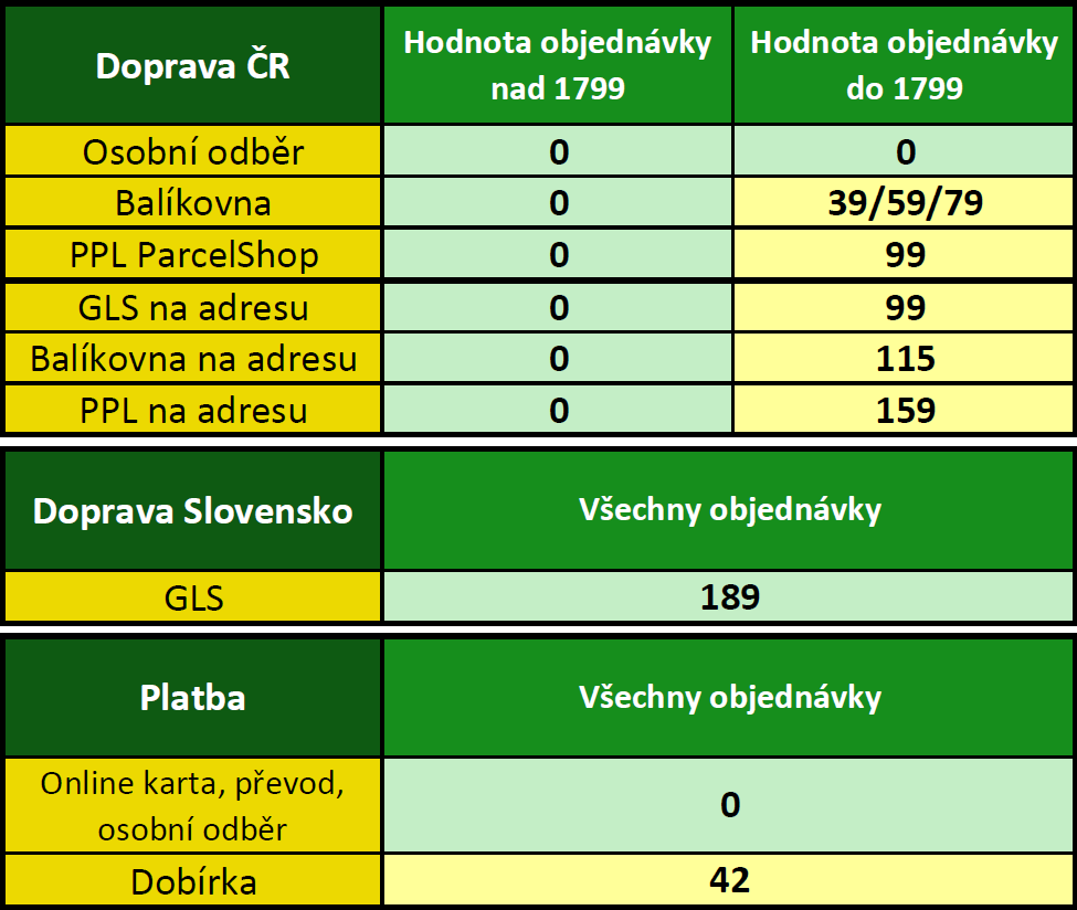 - Platba dobírkou je možná od hodnoty zboží 200,- Kč do hodnoty 7.499,- Kč.