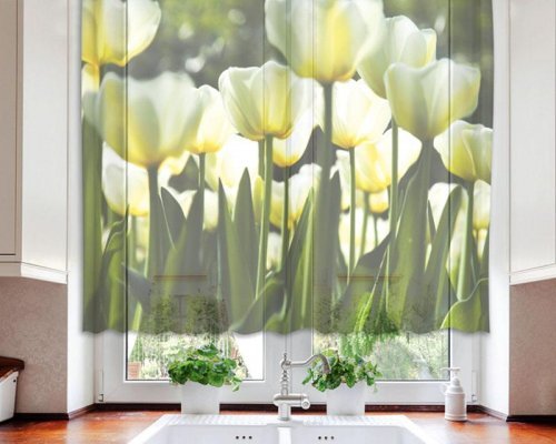 Jako v rozkvetlé zahradě si budete připadat s textilní foto záclonou s Bílými tulipány v rozměru 140 cm x 120 cm.