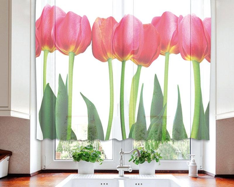 Textilní foto záclona Červené tulipány v rozměru 140 cm x 120 cm se budou skvěle vyjímat na vašem okně.