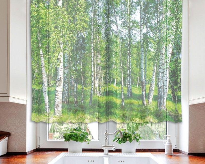 Textilní foto záclona Březový háj v rozměru 140 cm x 120 cm skvěle doladí Váš interier.
