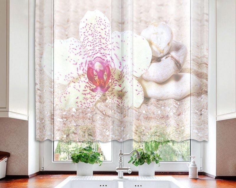 Motiv kamene, písku a orchideje na textilní foto zácloně Zen v rozměru 140 cm x 120 cm.