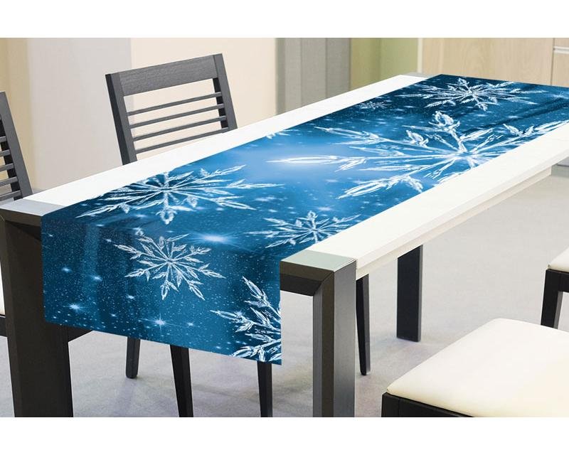 Elegantní ubrus - běhoun TS V04 se modrými sněhovými vločkami vytvoří vánoční atmosféru nejen u štědrovečerní večeře.